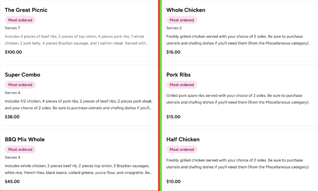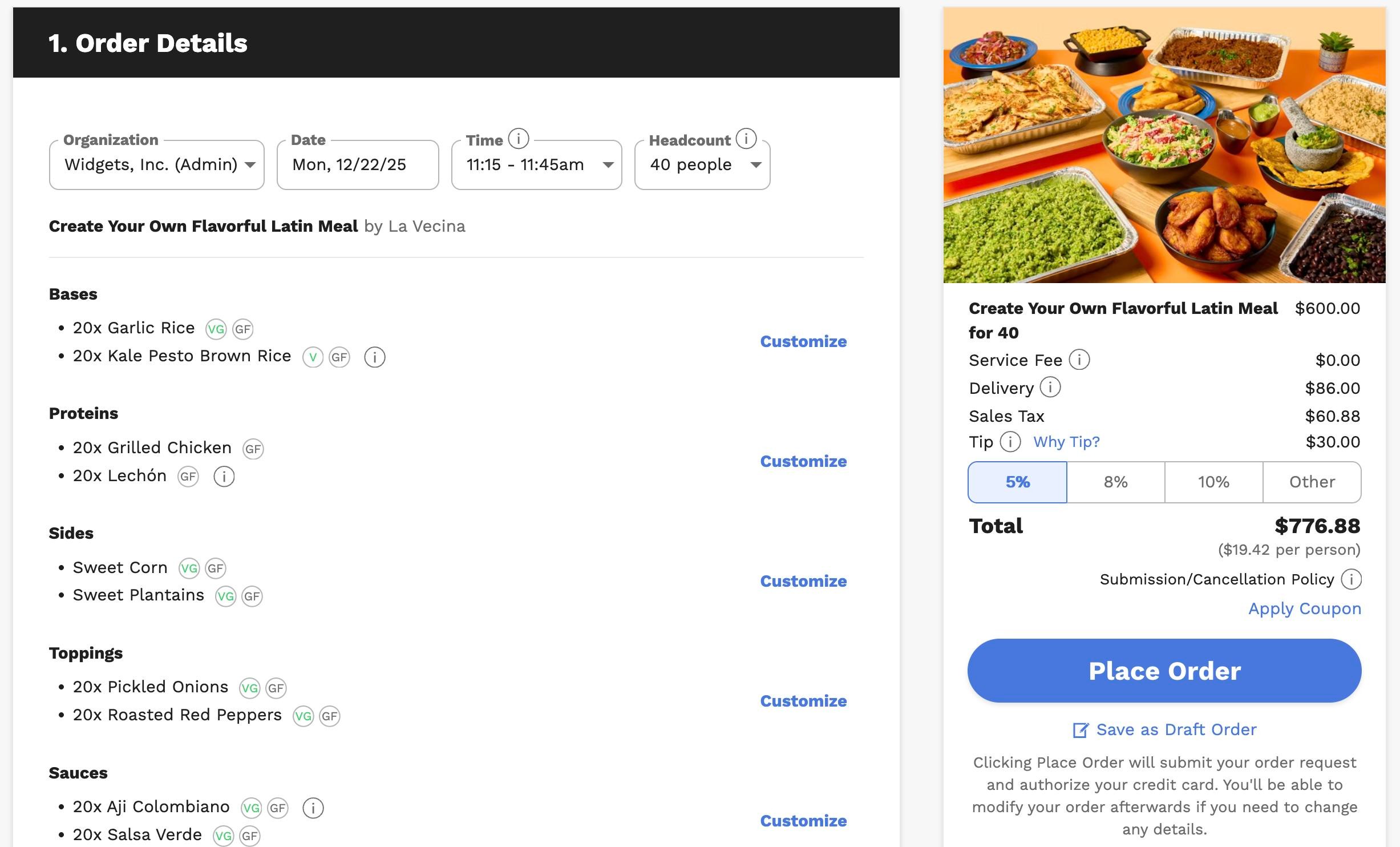 We break your menu down into easy-to-order, per-person packages by analyzing each category and suggesting sensible defaults based on item popularity and dietary needs.